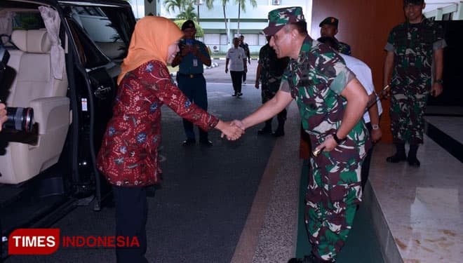 TIMES Singaraja/Pangdam V/Brawijaya, Mayjen TNI Wisnoe, P.B, menyambut kedatangan Gubernur Jatim, Khofifah Indar Parawansa di Makodam V/Brawijaya, Rabu (20/2/2019).(Foto: Istimewa)
